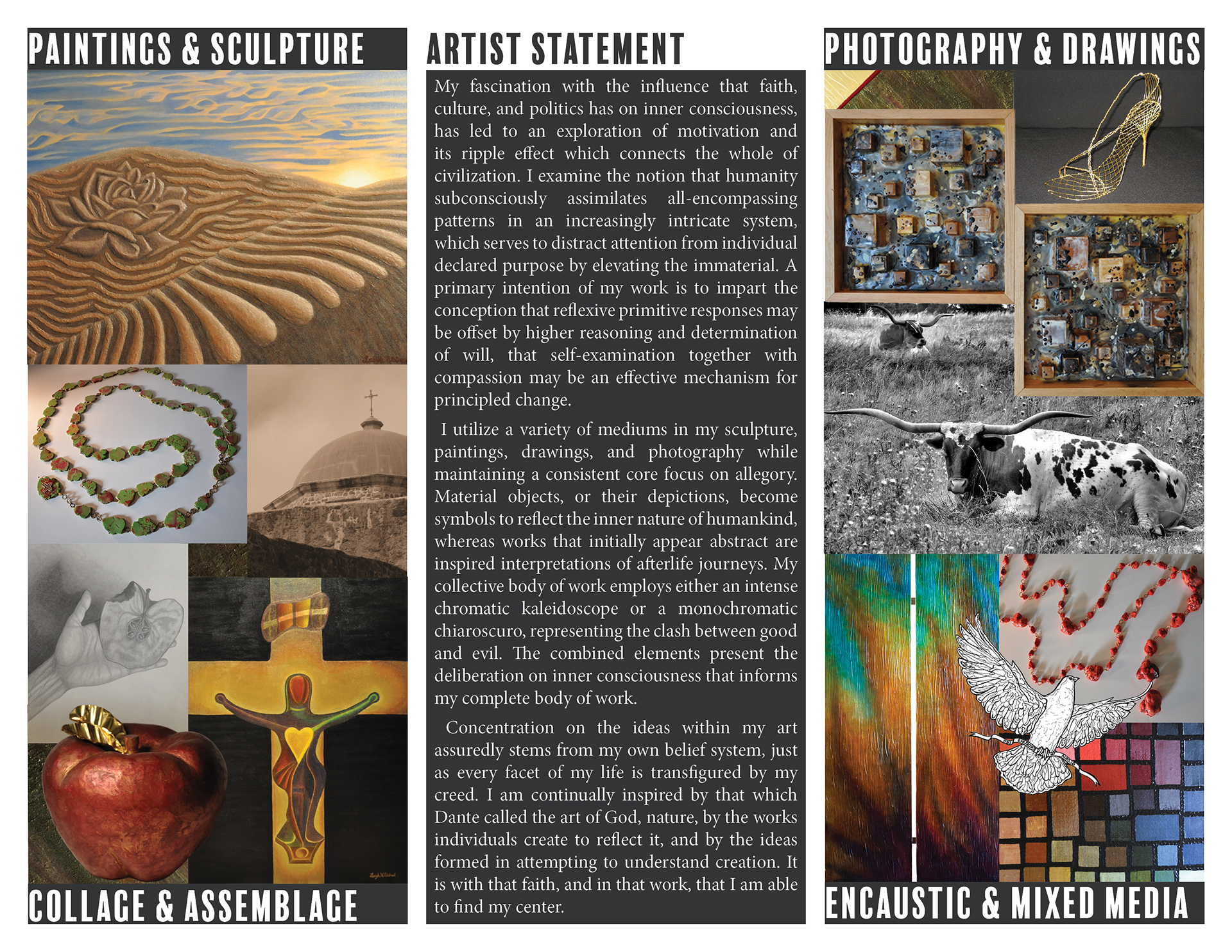 I utilize a variety of mediums in my sculpture, paintings, drawings, and photography while maintaining a consistent core focus on allegory. Material objects, or their depictions, become symbols to reflect the inner nature of humankind, whereas works that initially appear abstract are inspired interpretations of afterlife journeys. My collective body of work employs either an intense chromatic kaleidoscope or a monochromatic chiaroscuro, representing the clash between good and evil. The combined elements present the deliberation on inner consciousness that informs my complete body of work.